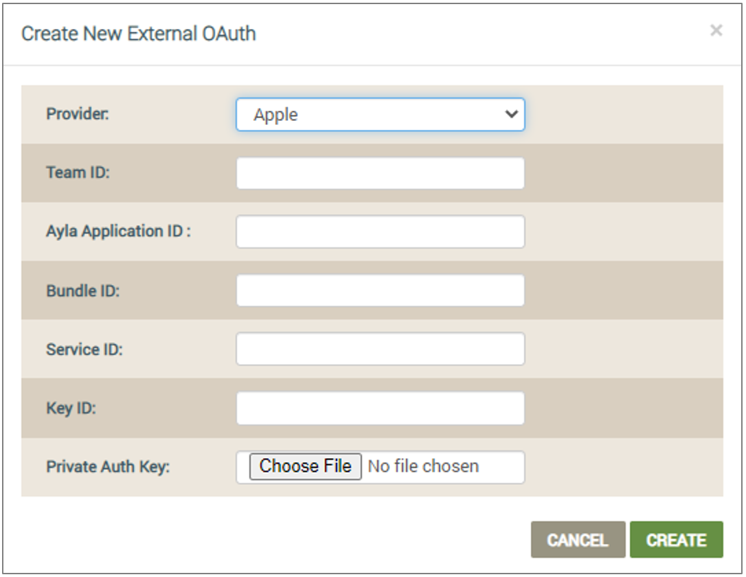 - For Private Auth Key, click the Choose File button to upload the file that contains your secret key provided by Apple. Unlike Google or Facebook who give you a string to enter as your secret key, Apple provides a file that our platform uses for authentication when you sign in to the Ayla application using your Apple credentials.