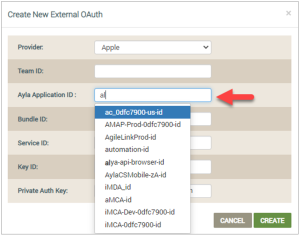 - For Ayla Application ID, select your Ayla-assigned application identifier in the drop-down list that displays when you start to type the ID in this field (an example is shown below).